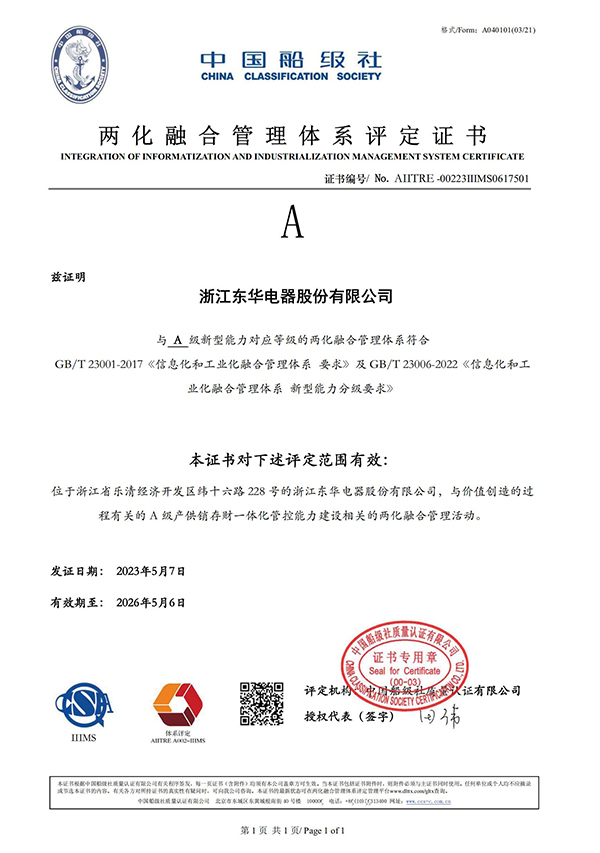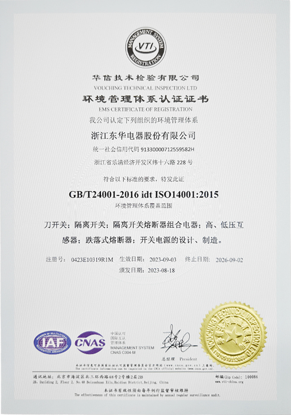 公司始終堅持以“創行業品牌,造專業品質,展員工所長,為顧客所想,遵章守法、預防為主、持續改進、健康安全”的管理方針和“為顧客創造價值;為企業謀求發展;為社會承擔責任”的經營理念來指導公司的經營生產;公司分別通過了ISO9001質量體系認證、ISO14001環境體系認證、ISO45001職業健康安全管理體系認證和兩化融合體系認證,生產產品擁有UL、CB、TUV、CE、CSA、KC、ERP、CQC認證和強制性產品認證自我聲明等認證及計量生產許可證,并符合ROHS生產管理要求及擁有出口自營權。東華電器作為專業制造的品牌產品銷售全國各地和亞、非、歐、美及東南亞等多個國家,深受用戶好評,連續多年被政府部門及上級主管部門評為《國家高新技術企業》、《浙江省科技型中小企業》、《先進企業》、《優秀企業》、《中國鄉鎮明星企業》、《浙江省新千年質量計量信得過企業》并連續二十五年被省金融部門評為《AAA級信用企業》等榮譽稱號,已成為大中型企業、主要工程和國家電網的重要配套產品,公司遍布國內外的經銷商,將隨時為您提供專業的技術支持和迅捷的售后服務,并成為您值得信賴的合作伙伴。